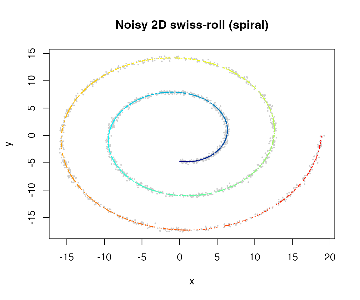 xlab = "x", ylab = "y", main = "Noisy 2D swiss-roll (spiral)")