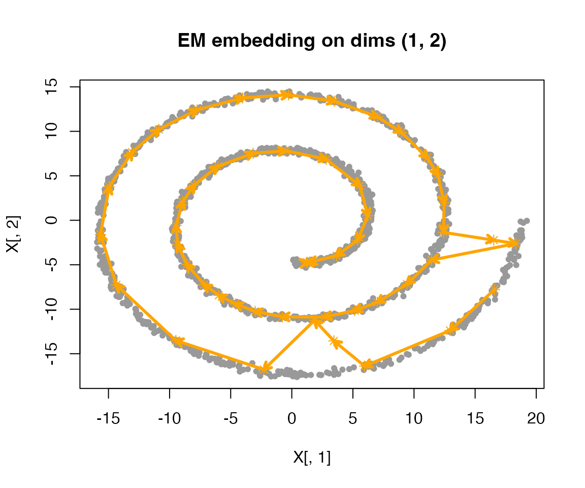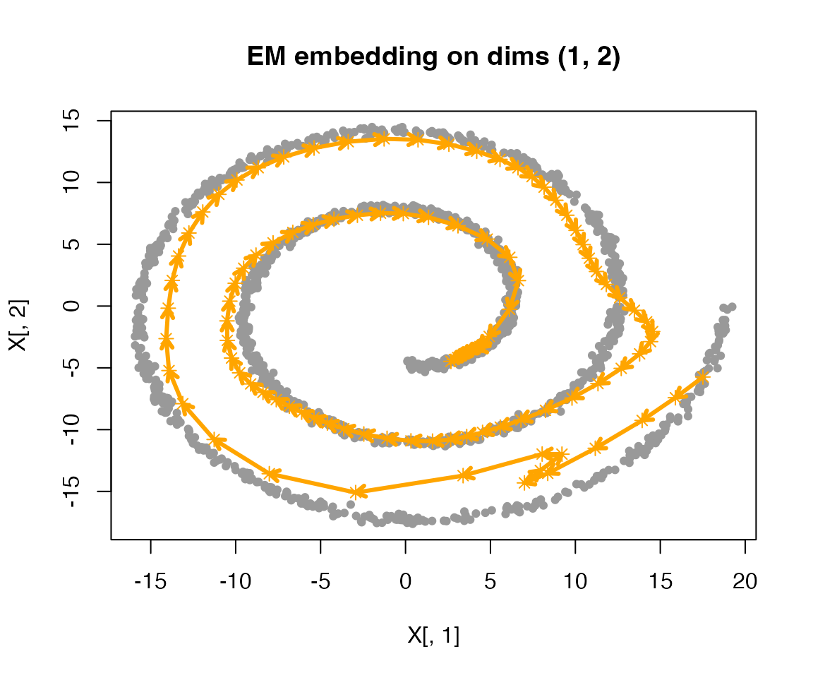 We simulate data from a spiral (swiss-roll) embedded in 2D space, then fit a smoothEM model.